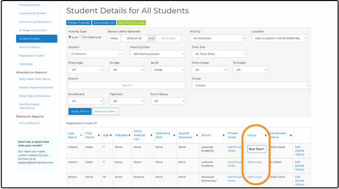 You can manage groups within the Student Details report, which provides a breakdown of participant information such as allergies, medical notes, special requests, private notes, and more. It also allows you to create and assign custom groups.